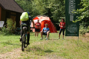 První závodník, vlastně závodníci, ale pouze na jednom dopravním prostředku, jsou Mirka Haisová a Jindra Prchlík – tandem 105. Vybíhám jim naproti je vyfotit. Oba vypadají hodně v pohodě. Mirka jak mě zmerčí, vykřikuje...