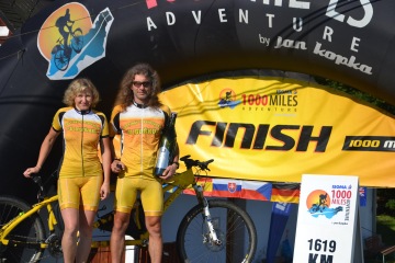 První závodník, vlastně závodníci, ale pouze na jednom dopravním prostředku, jsou Mirka Haisová a Jindra Prchlík – tandem 105. Vybíhám jim naproti je vyfotit. Oba vypadají hodně v pohodě. Mirka jak mě zmerčí, vykřikuje: „Úžasný závod!!! Celých 1600 kilometrů jsem koukala na Jindrovu prdel a Kopkův pytlík plný ořechů!“ Ještě je trochu prudím s focením a nutím, aby s tím autobusem vytočili prudkou zatáčku rovnou do cíle, jinak jim to neuznáme. Na poprvé to nedali. Sesedají, Jindra vypadá v pohodě a Mirka se furt směje. Nevím, jestli je to její běžný stav nebo je to tím adrenalinem. Tipuju na adrenalin. A Jindra to potvrzuje, že její nejtypičtější stav bylo hrobové ticho. Maximálně občas její odpověď na jeho otázku krátké úderné a výrazné HMM! Krizi prožili před „pětistovkou“ po spadnutí. Mirka bulila a Jindra byl naštvanej. Jindra: „Tak se na to můžem vykašlat a jít domů!“ A Mirka: „Já se na to ale nechci vykašlat!“ Takže nakonec možná díky ní dojeli až do F1000. Jindra ale kontruje, že to není pravda, že dojeli díky němu. Že kdyby měla Mirka vzadu brzdy, tak jsou teď teprve ve Vihorlatu. Ale vlastně tím nevědomky potvrdil, že je to opět její zásluha. Nebýt „Mirky bez brzd“, do cíle by se též nedostali. Z trasy Mirka vlastně nic neví, poněvadž koukala celou cestu Jindrovi na záda a jen šlapala. To musí být strašná schíza, prožila tu největší ze všech Mílařů. Přírodu si vždy prohlídla jen když spadli a zvedala se. Nejvíc ji bavilo posledních 200 metrů, jak jsem kolem nich lítal s foťákem.