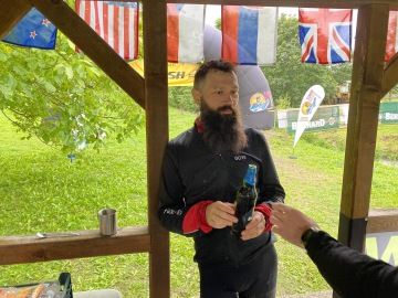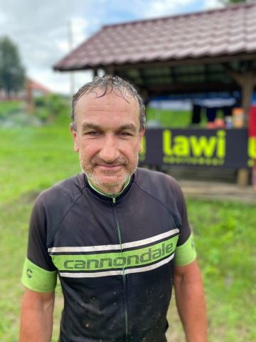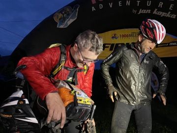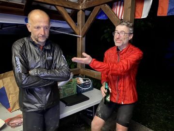 V cíli dnes zase žádná velká úroda nebyla. Je to nepřímá úměra – čím víc prší, tím méně se rodí… Ve čtvrtek pozdě večer dorazila jen dvojice Tilo Arnhold a Tomáš Doležal. Tomáš nás trochu překvapil, měl totiž nějaký problém s trackerem a tak jsme netušili, že jedou s Tilem. A oba naopak trochu překvapilo, že to skutečně dotáhli až do cíle! Tilo totiž vyrážel z Margecan, takže si dal na poslední den hodně přes 200 km a díky tomu, že ráno potkal Tomáše, spojili síly a dali si týmovou časovku. Tomáš prý hodně tahal (mimochodem, přijel na hodně postarším stroji s 26″ koly) a Tilo držel morálku a jednoduše zakázal zastávky. Proto taky přijeli úplně vyčerpaní (krom toho, že mokří, protože pro změnu pršelo) a vrhli se na vše, co šlo v cílovém prostoru pozřít! Tilo má za sebou letoškem osmou účast a rok od roku se významně zlepšuje, až to dotáhl na letošní desáté místo. Měl z toho obrovskou radost!