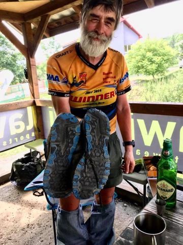 Nohy ho prý bolí, ale není to tak hrozné. Letos ani nijak zásadně netrpěl na puchýře. Nějaké má, ale vůbec to neřešil. Nohy nemazal, puchýře nelepil, boty měl jedny nové na startu a v cíli je hodil do popelnice. Jen v polovině závodu mu lehce natekl kotník a vyskočila kolem něj vyrážka, že se chvíli zarazil co s tím. Ale pak mávnul rukou a šel dál, že se to vstřebá…a vstřebalo!