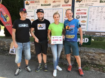 Následovalo vyhlášení úspěšných tisícimílařů, na jehož začátku byl jeden z vrcholů. Nejdelší čas na trase strávila dvojice chodců Jindra Prchlík a Mirka Haisová. A výjímečné na tom je to, že Jindra si tímto výkonem vysloužil nejen růžové triko za posledního závodníka na trase, ale jelikož dokončil „trojorunu“ (v jeho případě dokonce „čtverkorunu“, kromě klasického MTB s Mirkou ujeli Míle dvakrát i na tandemu), vysloužil si i triko zelené. A protože už chvíli měl na sobě triko černé pro legendy, byl poctivě navrstvem hned pěti triky najednou. A Mirka? Ta se stala první ženou, která obešla celé Míle a dokonce poctivě po cyklistické trase. A pro jistotu si k tomu vybrala o cca 200 km delší ročník, čili 1.860 poctivých kilometrů. Není divu, že až na Afterparty, tedy po bezmála dvou měsících obula pevné boty, do té doby musely stačit pantofle dokonce i k účasti na svatbě :-)