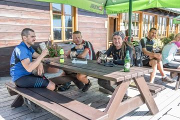 Předem se omlouváme, že nezmíníme jména všech, kteří nás dnes navštívili. Bylo toho opravdu hodně ;o) Dopolední atmosféru rozřízl příjezd „Hujerů“ – fan klubu závodníka Martina Motyčky z Osíku u Litomyšle. Napočítal jsem 15 dospělých, 2 děti a vzrostlého psa ;o) Martin byl ale ještě pár hodin od cíle a tak nám tahle veselá kopa zpříjemňovala celou dobu jejich pobytu. To závodníci z Německa Christian a Marcus byli fakt dobří. Samý úsměv, opičky do objektivu. Pak jsme zjistili, že zápis jejich trasy je spíš přerušovanou než souvislou čarou. „Šaize“ ale padlo relativně potichu a snad jen jednou ;o) Úsměvy probíhaly dál a po dobré snídani se kluci vydali na další pouť. V dobrém rozmaru se však vydali úplně opačným směrem a i přes naše hlasité povykování si to vesele frčeli dál po asfaltu dolů do Hanušovic. Naštěstí pro ně si to ale vzápětí uvědomili a vrátili se zpět. Uvítali jsme je dnes již podruhé na CP2 a pak již bez zastávky pokračovali správným směrem. Také nás navštívil Jakub Šváb, jehož táta Miroslav bojoval s nástrahami trasy o několik desítek kilometrů nazpět. Jde vidět, že Míle již prorůstají napříč generacemi a že rodina Chuchmů již není výjimkou. Oba zástupci rodu Švábů se toho nebojí a oba nezávisle jeden na druhém vyrazili směr Sedlice. To Lukáš Werner si u nás vysloužil přezdívku Destruktor. A to tím, že předával pěkně pomlácenou gpsku. Pavouk na ní jak tarantule…. Kolega co dojel s ním nám říká: „A to so ho zeptej na mobil a brašny…“ Tak jsme se zeptali. Údajně prvně odrovnal brašny, pak při pádu rozbil telefon a o den později při jiném pádu popraskal display gpsky… Zřejmě porce smůly vybrána na dlouho dopředu. V zájmu zachování Lukášova zdraví v to doufáme ;o) Pak jsme se přivítali s první ženou v cíli 500 – Gabrielou Matějíčkovou. Všechny dnešní návštěvníky CP2 strčila do kapsy co se krátkosti pobytu u nás týče. Rychle se občerstvila, nabila baterie, vybalila, zabalila a za hodinu zase hurá dál. Druhá žena v pořadí Jiřinka Lípová dorazila v tandemu s usměvavým Rosťou Gregorem a po dobrém obědě oba pokračovali dál. Celkem 12 závodníků se u nás dnes rozhodlo svoji cestu ukončit – ať už měli nahlášenou 500-stovku, či původně chtěli pokračovat. Důvody byly čas, dovolená, zadek, stačilo…. V jednom případě byl důvod prasklá Leftyna u stroje. Co se techniky týče, tak dnes to u nás vypadalo tak, že moc nefunguje. Viděli jsme tu dnes mnoho otočených strojů – výměnů destiček, řetězů, ladění mašin na další porce kilometrů….
