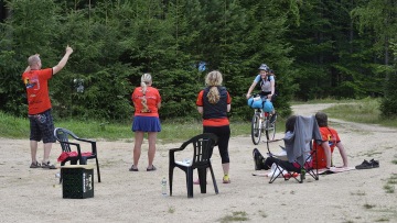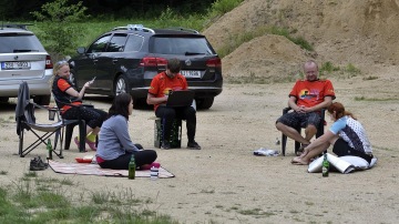Po dopoledním odchodu této závodnice již lehce prořídlé řady dobrovolníků opustili Vašek s Vlaďkou… S jejich odjezdem pro letošek utichl i zvuk elektrocentrály, na který již někteří měli slušnou alergii. Příchod dalšího závodníka se očekával až ve večerních hodinách, proto po úklidu v CP šéfová vyhlásila rozchod a volnou zábavu… Pro bikery z řad dobrovolníků vymyslela Singl track pod Smrkem, Tomáš zvolil projížďku do Harrachova. Nikoho dalšího už výlet nezlákal a ti, co zůstali se rozložili na písku za srubem a chytali bronz. Zvláštní důraz byl v odpoledním žáru kladen na pitný režim, každý si to však vysvětloval po svém. Na improvizované pláži byly k vidění nejen plastové lahve od vody, basička od Bernarda, ale i několik obalů od kefírového mléka. Je proto možné, že latrína, ještě před jejím zasypáním bude navštěvovaná častěji, než by se na téměř osiřelém stanovišti očekávalo…