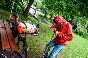 Už za vytrvalého deště dorazil Martin Novák. Slouho hledal cestu přes Váh a když už to vypadalo, že se do vody neodhodlá se odhodlal a brodil. Nadvakrát, ale úspěšně. Martin přišel a rovnou zalezl do stanu se trochu zahřát a vyspat, chce vyrážet velmi brzy. Honza jel těsně za Martinem, ale v poslední vsi se rozhodl navštívit obchod, tak nakonec do CP dojel se ztrátou hodiny a půl, ale najedený a ráno se síly stejně srovnají… Zarazilo nás je, že si oba na kost promočení mílaři před brodem sundávali tretry. Ale pak nám vysvětlili, že mají dobré návleky a nohy překvapivě v relativním suchu…